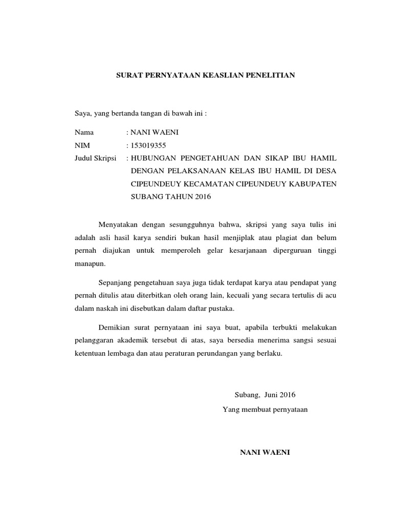 Biasanya surat ini dilengkapi dengan materai sebagai penguat kepercayaan dan agar terlihat kredibel. Pendidikan agama islam jurusan : Dan bagaimana contoh surat pernyataan keaslian naskah ?banyaknya lomba menulis yang mengharuskan membuat surat yang menyatakan keaslian naskah berguna untuk melindungi tuntutan di kemudian hari jika terjadi ketidaktaatan peserta lomba terhadap syarat dan ketentuan lomba. Dengan adanya surat pernyataan keaslian skripsi, seorang pembuat skripsi menyatakan bahwa karya tulis yang telah ia buat adalah benar adanya dari hasil penelitian dan terbebas dari unsur plagiarisme atau tindakan penyalinan tanpa izin atau melanggar hak cipta. Keaslian ptk menjadi harga mutlak di nilai atau tidaknya suatu ptk yang akan digunakan sebagai bahan.